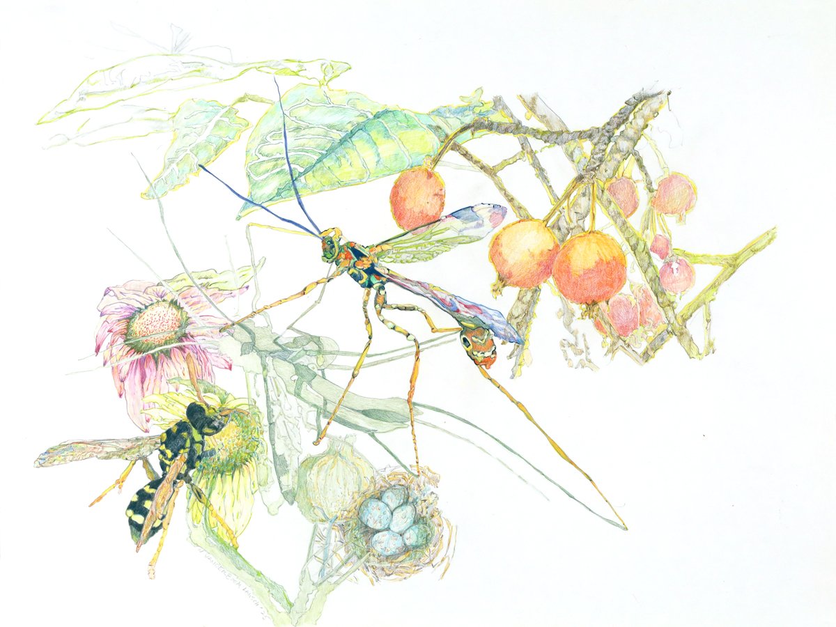 Mixed media drawings on heavy white paper with HB2 pencil, color pencil, and marker.